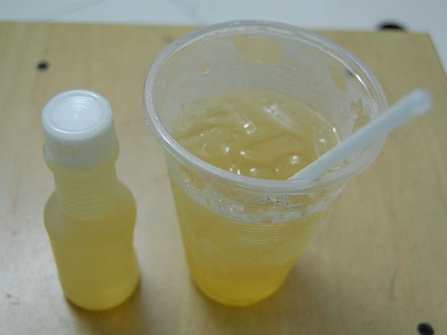 Tại khu vực pha chế của một quán trà chanh, không có vỏ chanh cũng như bả trà, chỉ phát hiện thấy một bịch bột màu trắng và một chai nước có màu vàng như nước rửa chén để trên bàn.